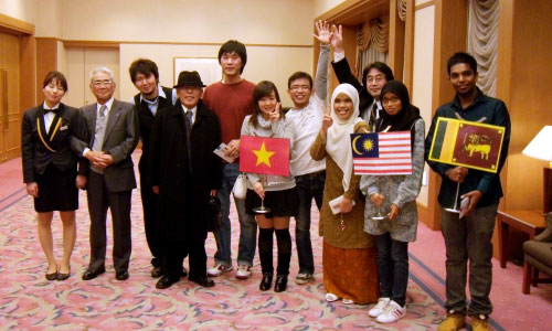 途中、留学生達の母国にまつわるクイズが出題され、なかなか解らない問題に大いに盛り上がり正解した留学生に景品が手渡されました。また、一人ひとりに自己紹介をしてもらい、若さあふれる彼らの夢や未来、そして母国の気候と日本の違いなどが話されました。皆一同に「皆様も一度私たちの国へお越しください」とのこと。