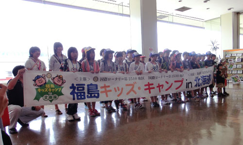 8月18日㈯、国際ロータリー第2510地区が行なう「福島キッズキャンプ in 北海道」へ福島県飯舘村から25名の子ども達と、ボランティアスタッフ6名が苫小牧港西フェリーターミナルへ到着しました。細川ガバナー、市町ガバナー補佐をはじめ第12グループの各会長、幹事以下18名がお出迎えしました。細川ガバナー、市町ガバナー補佐の挨拶。第2530地区、伊藤ガバナーよりの「親書」を進呈され、子ども達の代表が高らかに「宣言」を行ないました。この北海道で楽しい想い出を一杯ポケットに詰めて帰られる事を願い、目的地へと出発する子供達を見送りました。
