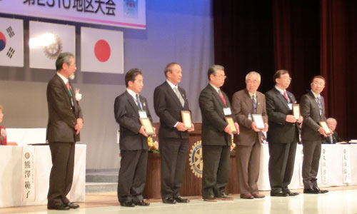 静内で行われた地区大会では、細川ガバナーが体調を崩しよろけるシーンがありましたが、市町ガバナー補佐、橘苫小牧北RC会長が手を差しのべ、大事にはいたりませんでした。そして、当クラブ梶川会長がクラブを代表し、表彰を受けました。